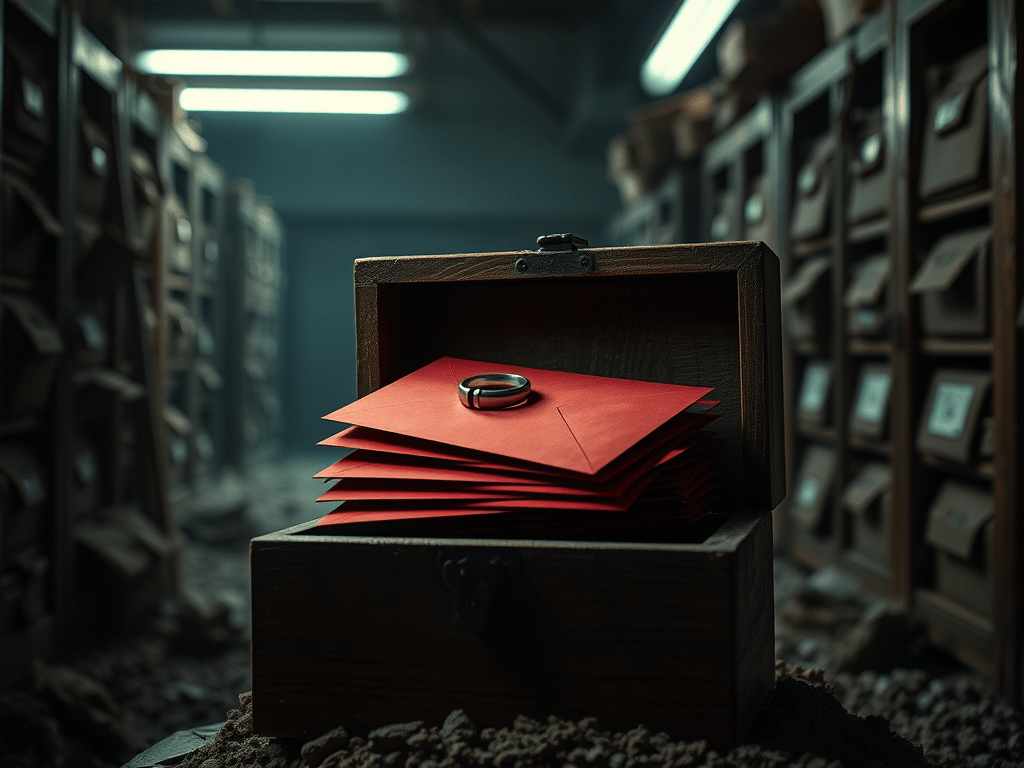 Inside, yellowed envelopes. All red. Dozens.