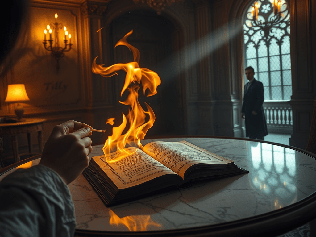 Tilly turned away from Nathaniel, walked toward the center of the room, and placed the manuscript on the marble table beneath the golden light. Her fingers lingered on the cover for only a moment.